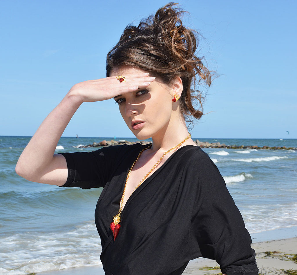 Die Herzen in den Ohrringen beeindrucken durch ihren intensiven roten Brandlack. Wir verwenden Brandlack, ähnlich dem Kalt-Emaille. Durch mehrmaliges Auftragen von Hand entsteht ein unwiderstehlicher Tiefenglanz. Unser Brandlack ist UV-geschützt und deutlich abriebfester als ein herkömmlicher Lack. Eine Kostbarkeit für alle, deren Herz entflammt ist oder die schon das eine oder andere Inferno überstanden haben!