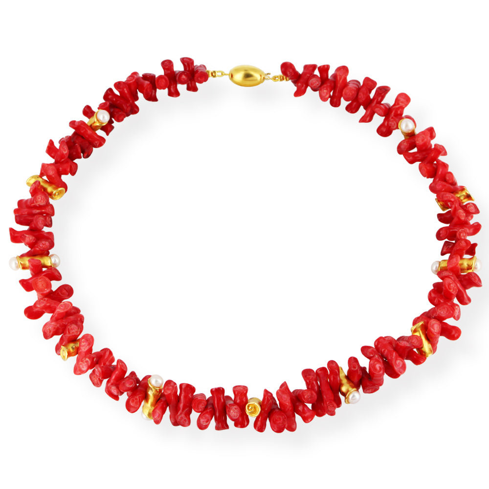 Wunderschönes Korallen Collier mit 10 goldplattierten Deko-Elementen und großem Tonnenschloss in der Länge von 45 cm. Aus der Kollektion Bambus. Collier Breite ca. 16 mm.
