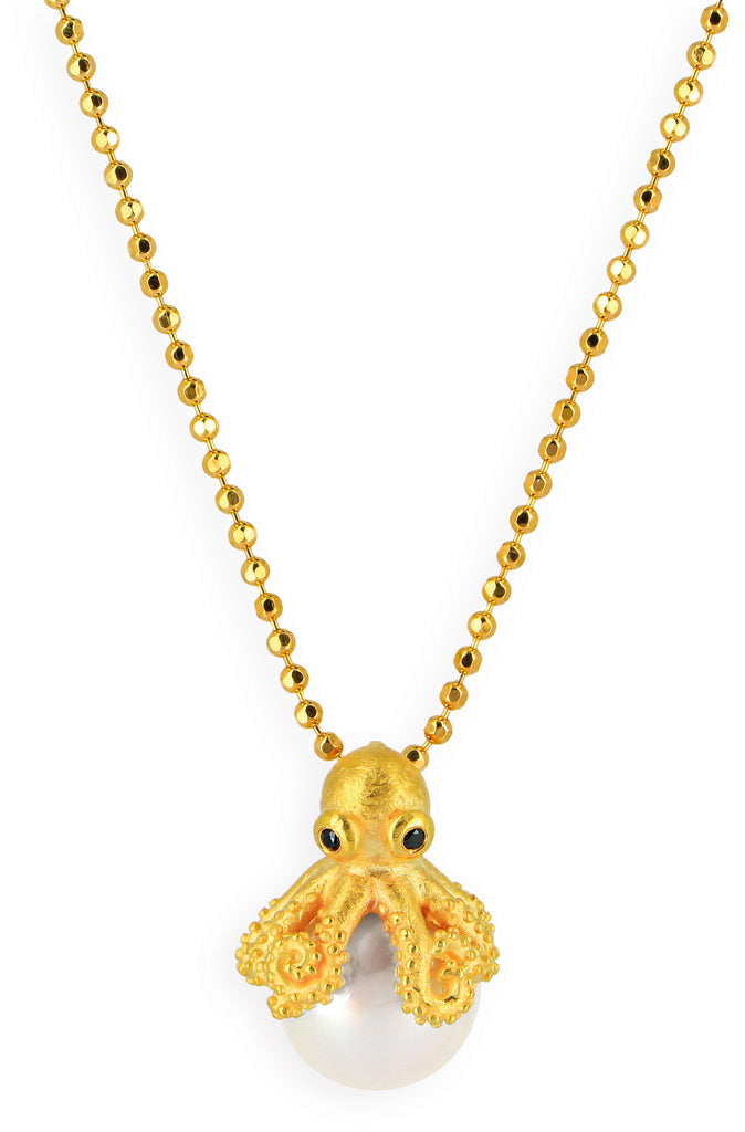 Das niedliche Set besteht aus dem Baby Oktopussy "Ole" Anhänger (D MSOK 33/AGG) aus Silber goldplattiert mit Süßwasserperle und Spinell und der passenden facettierten Kugelkette (Länge 45 cm).