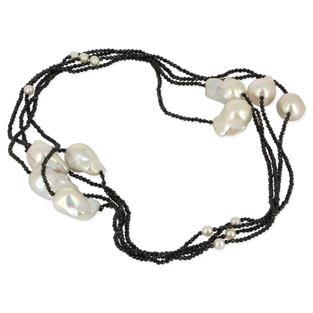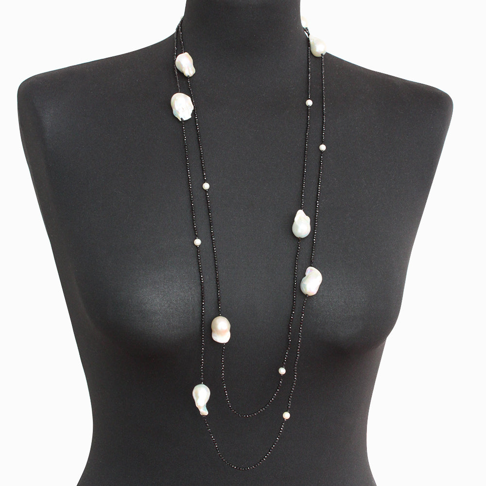 Ausgefallene Kette aus schwarzem Spinell und Barockperlen in der Länge 180 cm