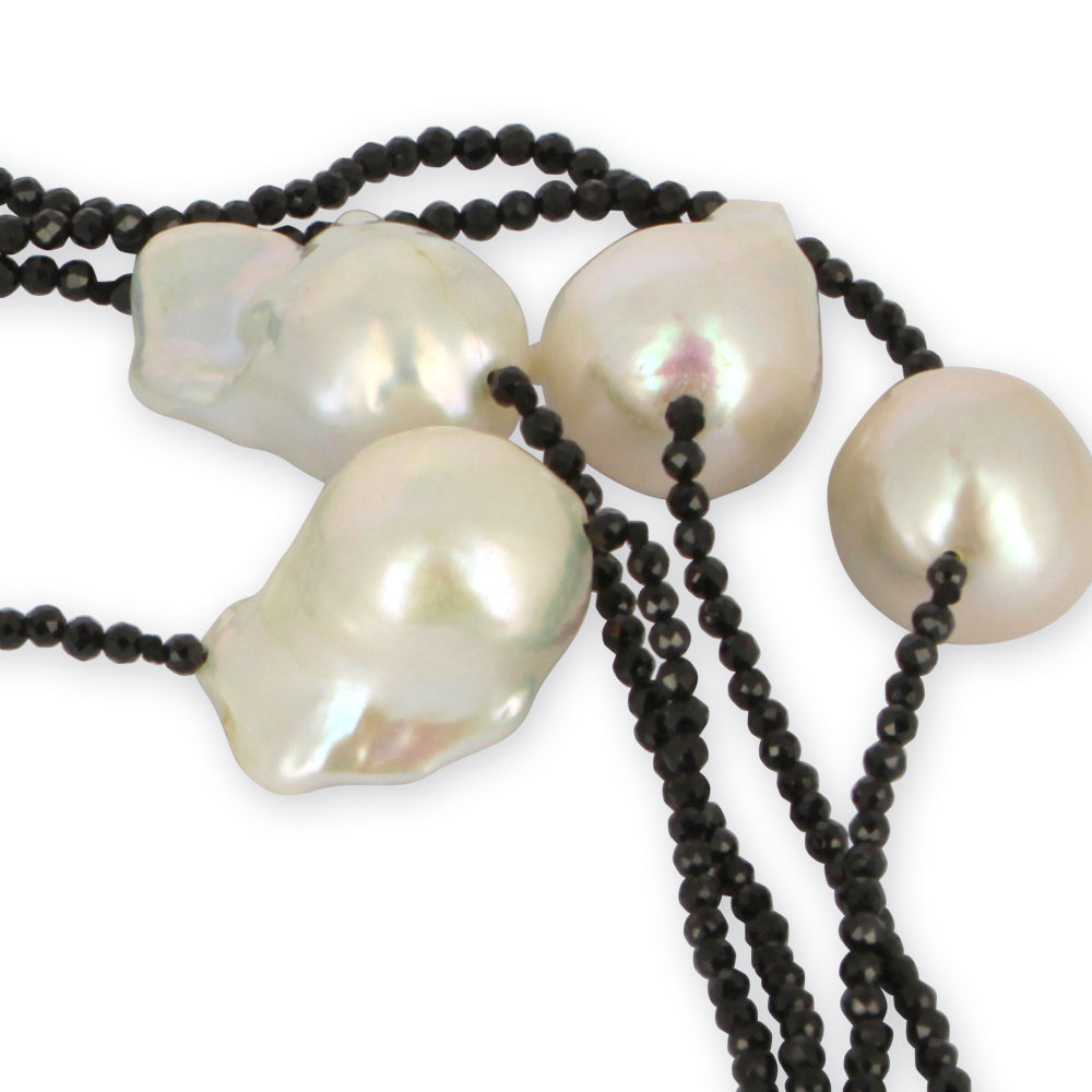 Ausgefallene Kette aus schwarzem Spinell und Barockperlen.