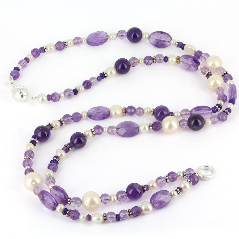 Die Kette ist ein wilder Mix aus Süßwasserperlen, und Amethysten in unterschiedlichen Größen und Schliffformen. Dieses Traumstück lebt durch sein "geordnetes Chaos" und hat dadurch einen unvergleichlichen Bohem Style.