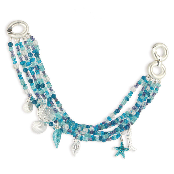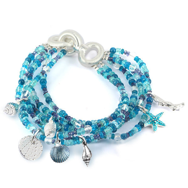 Neptuns Garden, 6-reihiges Armband aus blauem Edelstein Mix mit 7 Muscheln und Knebelverschluss aus Silber. Die Länge des Armbandes beträgt 22 cm.