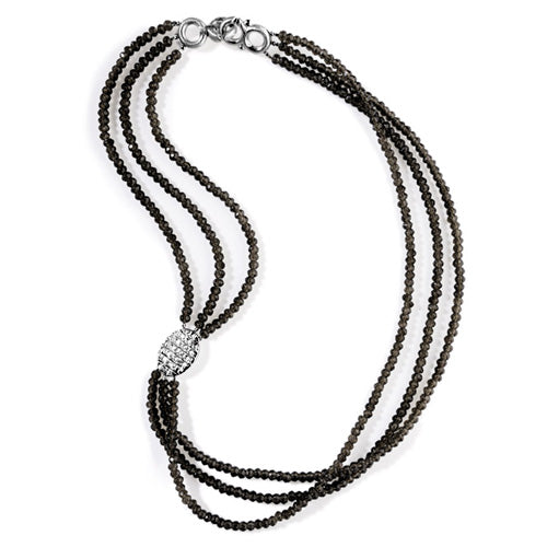 Croco, 3- reihige Rauchquarzkette mit Crocoplättchen und Knebelverschluss aus Silber.