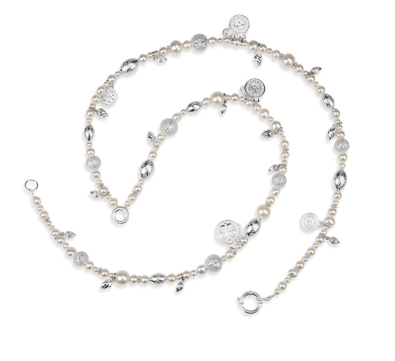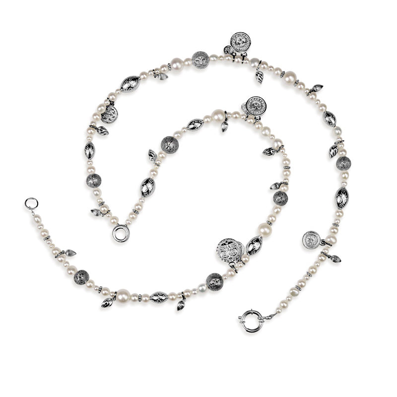 1001 Nacht, Perlen Kette mit Münzen, Dekoelementen & Schmuckfederring aus Silber. Die Länge der Kette beträgt 85 cm.