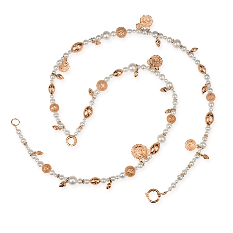 1001 Nacht, Perlen Kette mit Münzen, Dekoelementen & Schmuckfederring aus Silber rotgoldplattiert. Die Länge der Kette beträgt 85 cm.