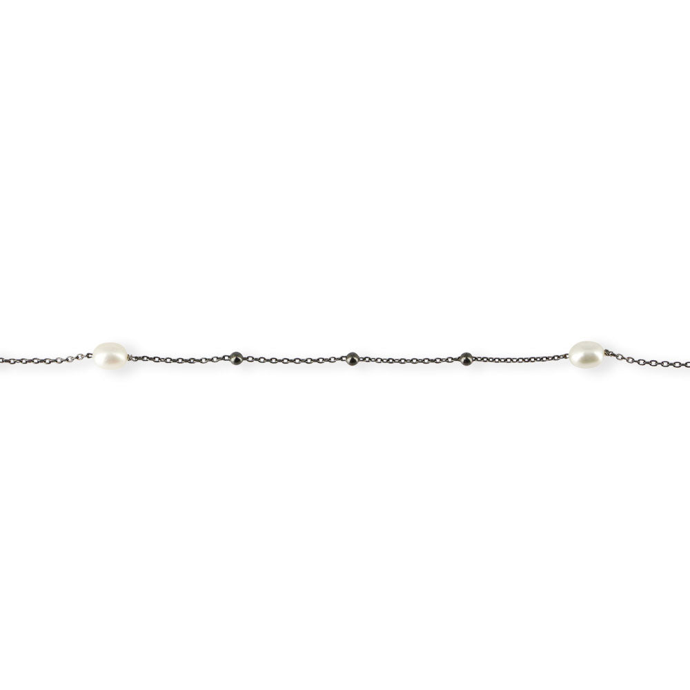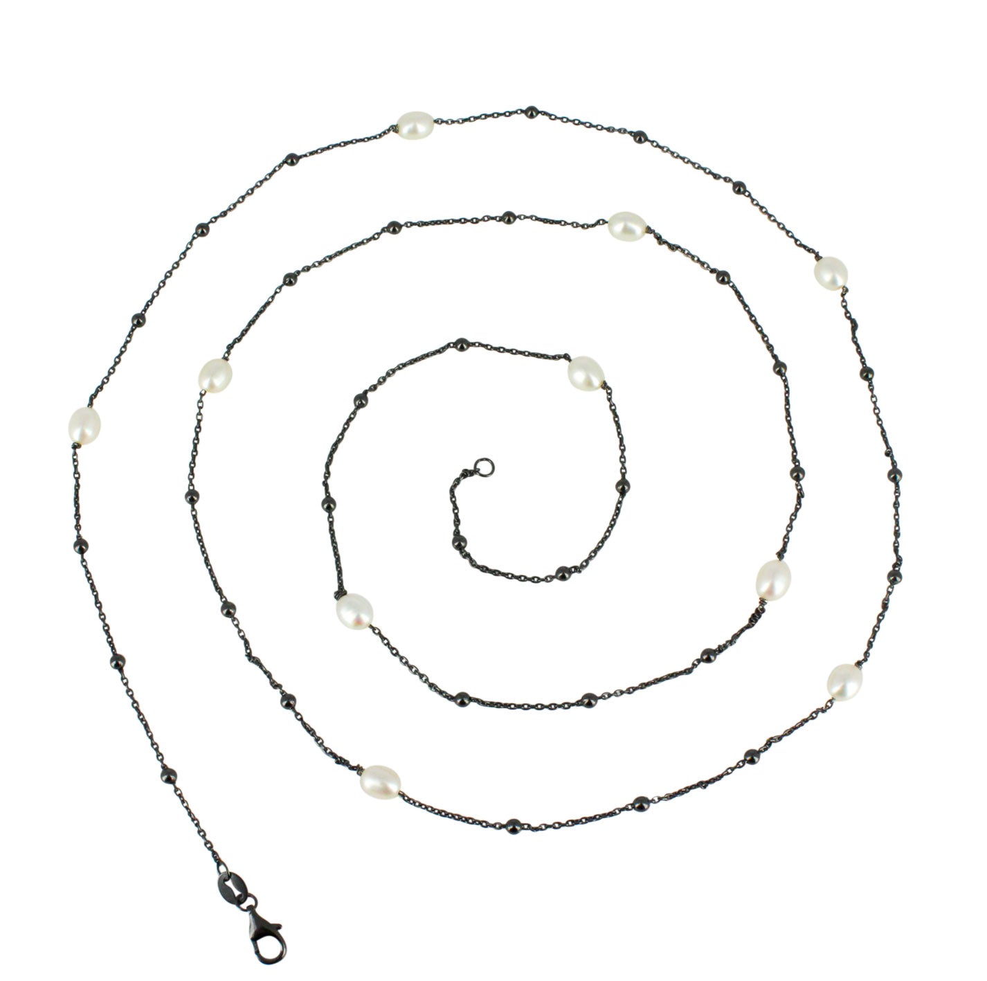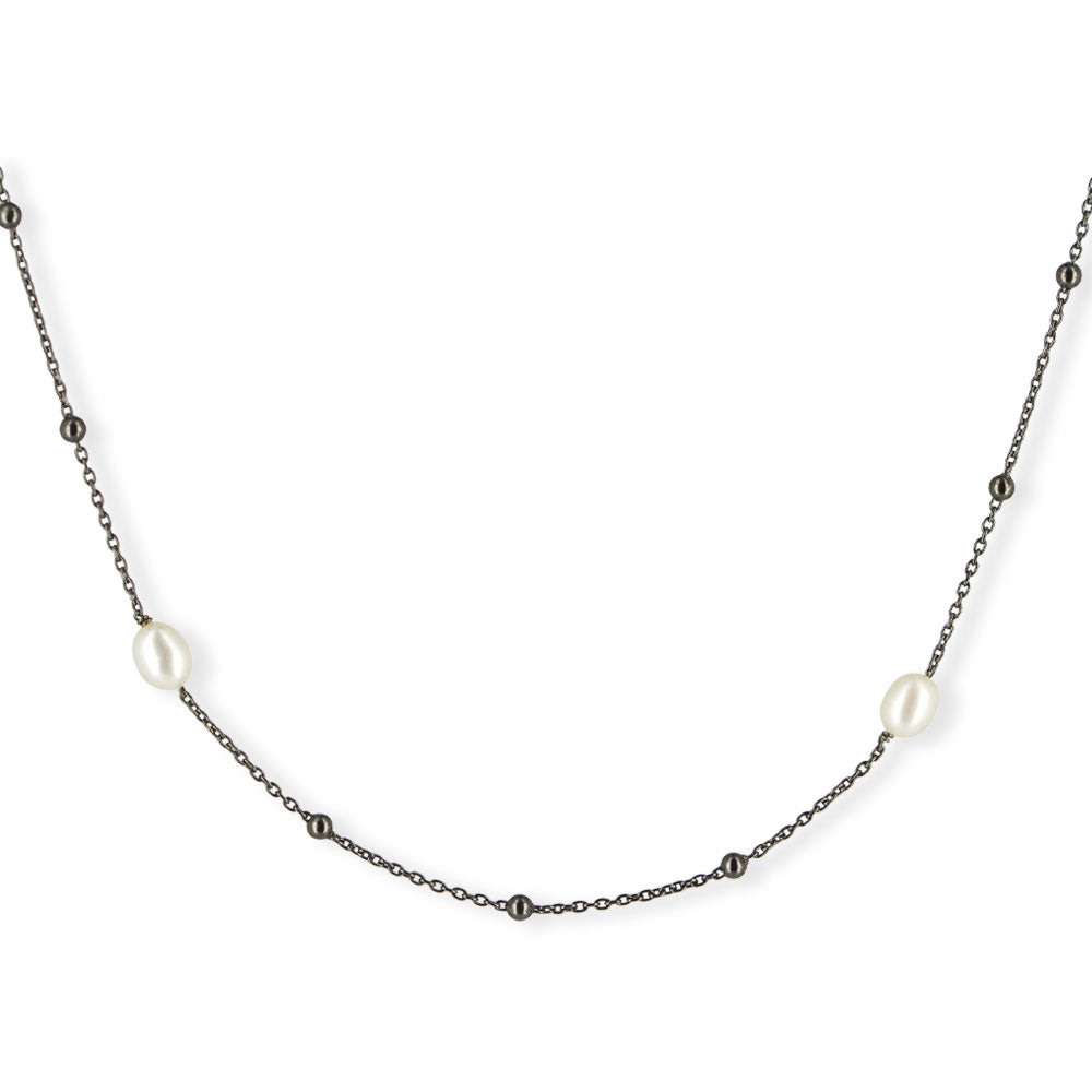 Feine Ankerkette aus Silber im Vintagelook mit Süßwasserperlen Silberkugeln und praktischem Karabinerverschluss in der Länge 95 cm