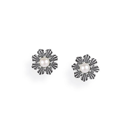 Queen Lisbeth, kleine Blüten Ohrstecker aus Silber im Vintagelook mit Süßwasserperle.