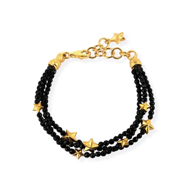 Sternenglanz & Schattentanz, Edelsteinarmband aus Onyx 3 -reihig mit acht Sternen, schönen Endkalotten, stabilem Karabiner und Verlängerungskette aus Silber goldplattiert.