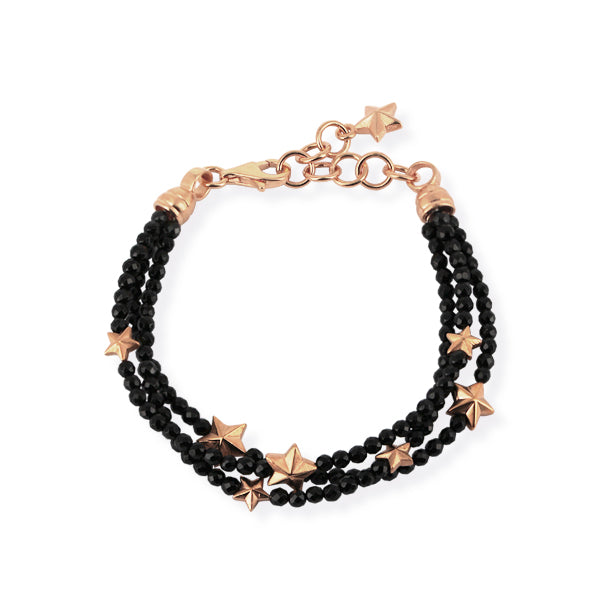 Sternenglanz & Schattentanz, Edelsteinarmband aus Onyx 3 -reihig mit acht Sternen, schönen Endkalotten, stabilem Karabiner und Verlängerungskette aus Silber rotgoldplattiert.