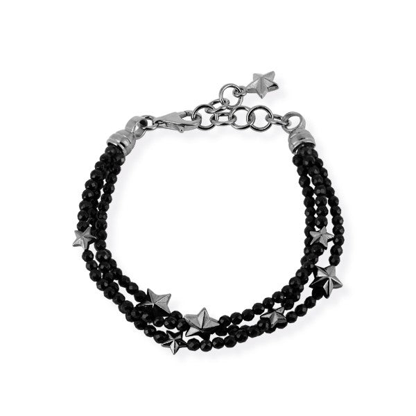 Sternenglanz & Schattentanz, Edelsteinarmband aus Onyx 3 -reihig mit acht Sternen, schönen Endkalotten, stabilem Karabiner und Verlängerungskette aus Silber.