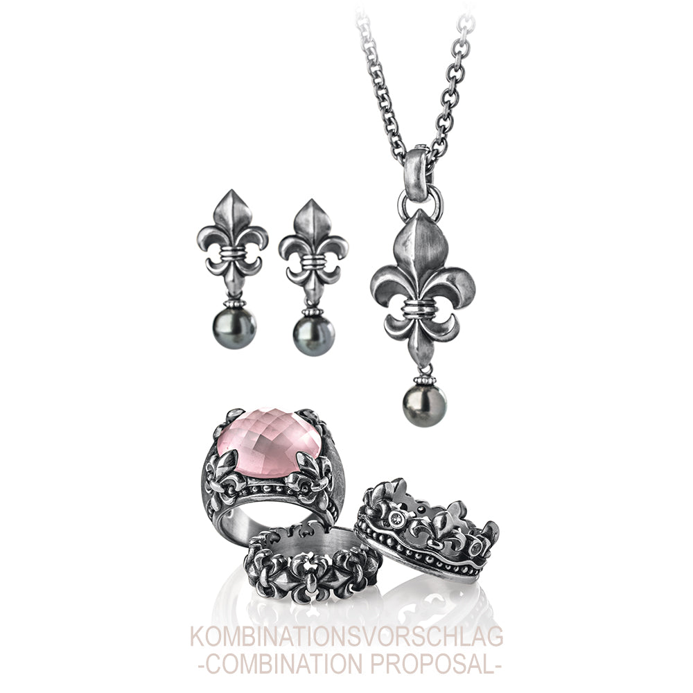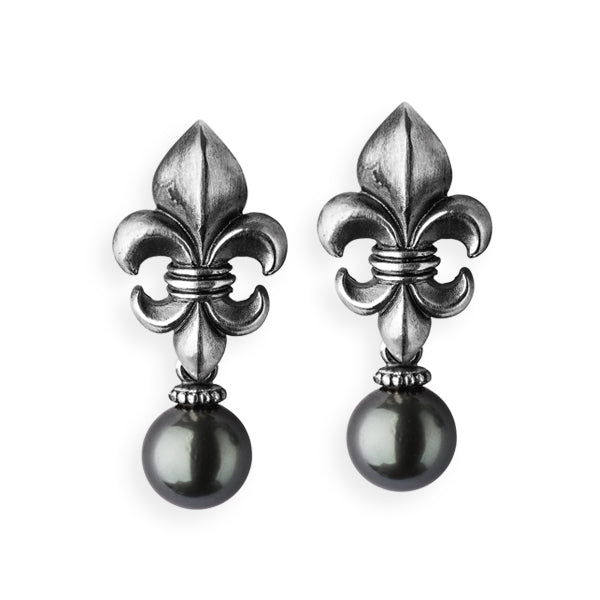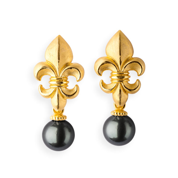 Die sorgfältig mattierte, teils glänzend polierte Oberfläche lässt die Lilien in ihrer Symmetrie besonders plastisch zur Geltung kommen und verhilft ihrer Trägerin zu einem eleganten Auftritt. Die dunklen Tahitiperlen mit schönem Lüster verstärken die edle Erscheinung. Ein ideales Schmuckstück für Königinnen, die ausgefallenen Ohrschmuck mit wertvollen echten Tahitiperlen lieben.