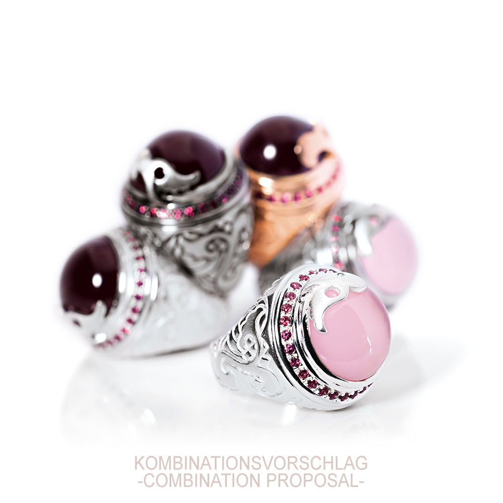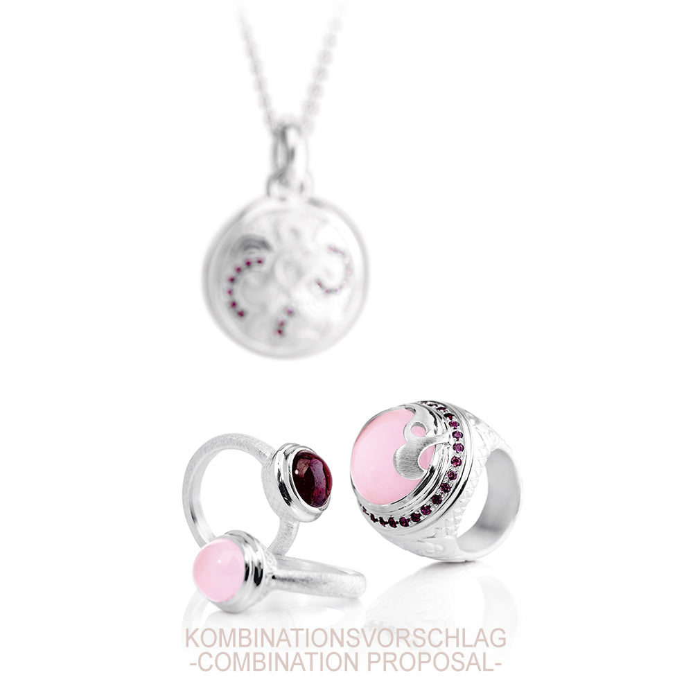 Der wunderschöne, sanft rosane Rosenquarz im Cabochonschliff hat einen Durchmesser von 18 mm. Unsere Rosenquarze sind Natursteine und jeder von ihnen ist ein wenig anders, dies ist ein Zeichen der Echtheit der Steine und lässt sich nicht verhindern. Strahlend in Szene gesetzt und rundherum eingerahmt wird der bezaubernde Rosenquarz von einem funkelnden Pavéeband aus facettierten Rhodolithen.