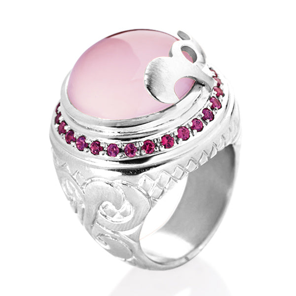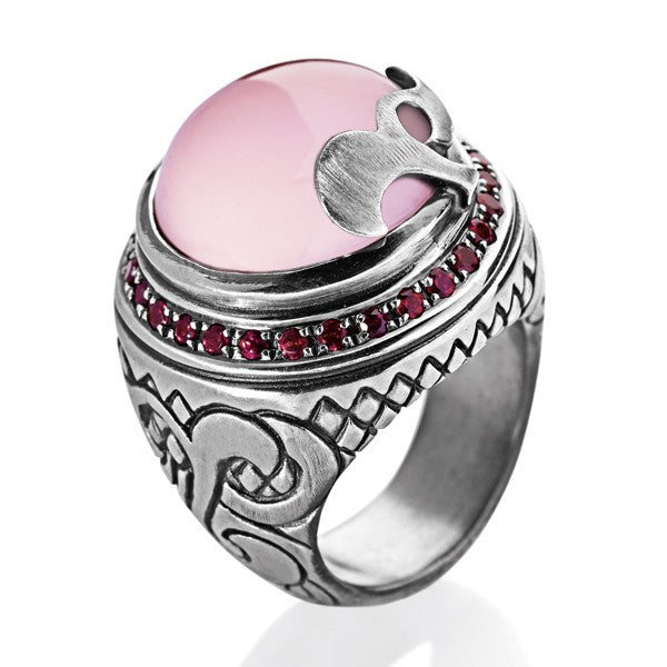 Long, großer Ring aus Silber im Vintagelook mit Rosenquarz und Rhodolitpavée.