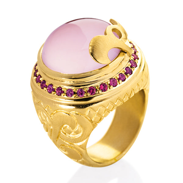 Long, großer Ring aus Silber goldplattiert mit Rosenquarz und Rhodolitpavée.