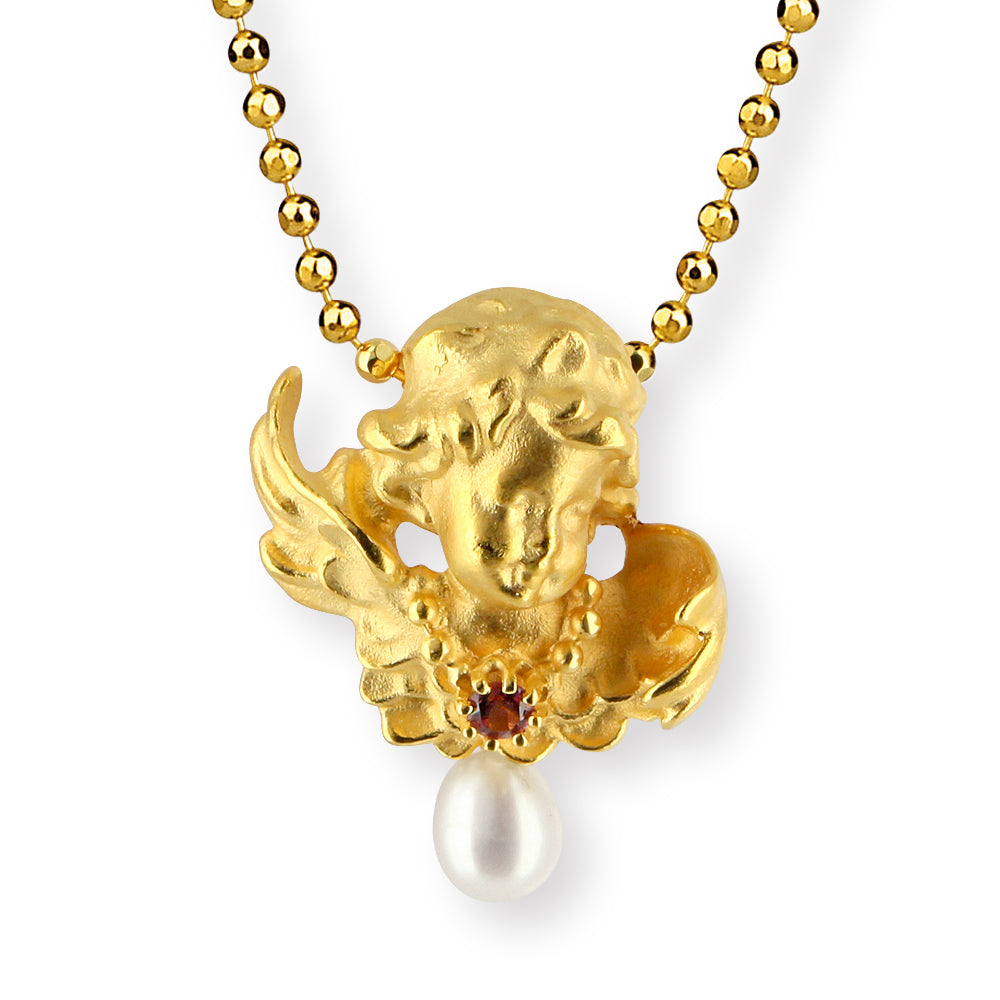 Rafael kleiner Engel Anhänger aus Silber goldplattiert mit Rhodolith und Süßwasserperle