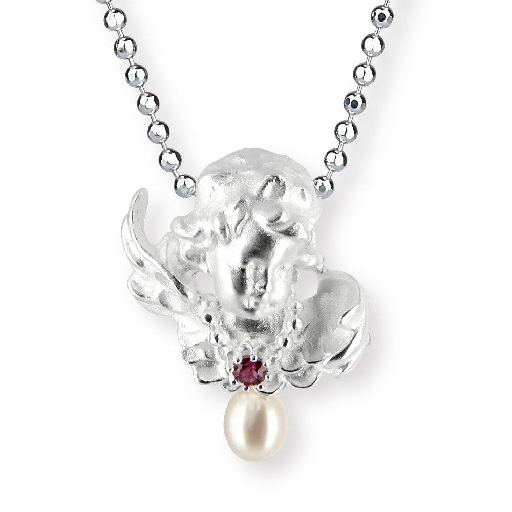 Rafael kleiner Engel Anhänger aus Silber mit Rhodolith und Süßwasserperle