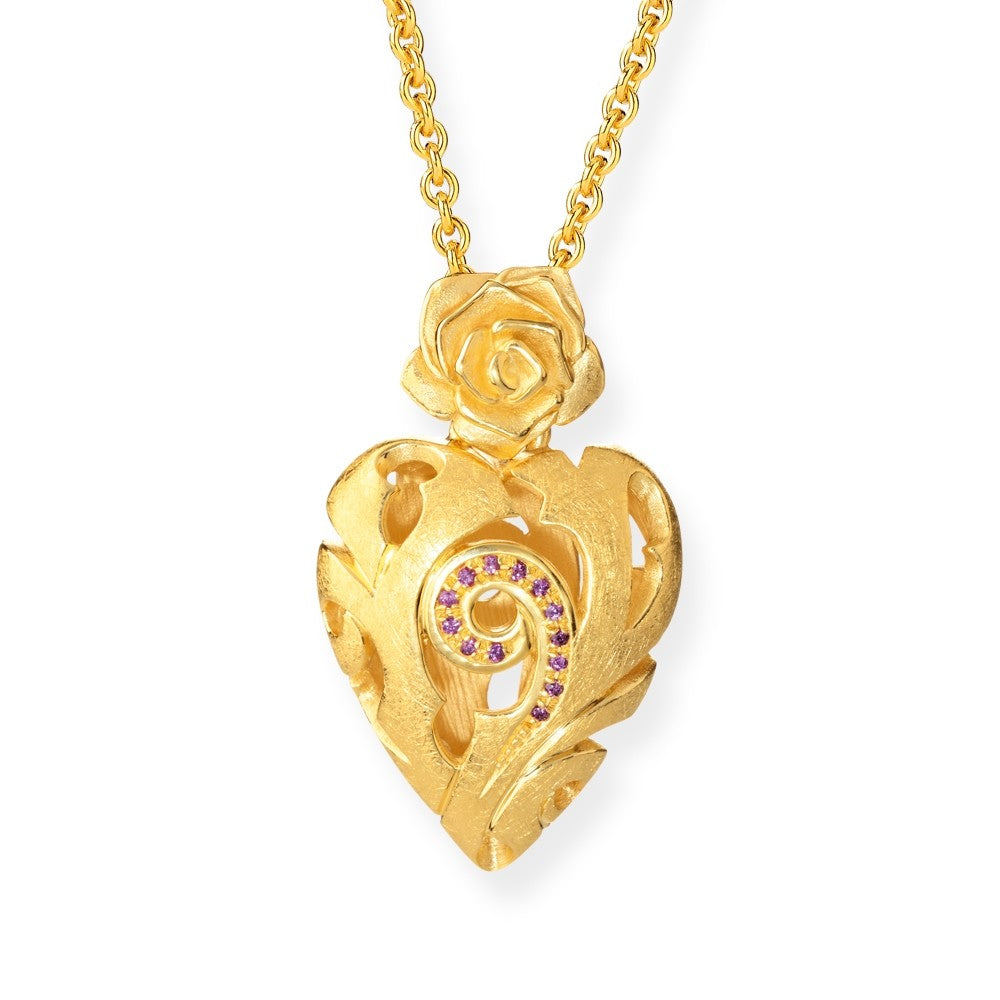 Rose of Antoine, mittlerer Rosen Herz Anhänger aus Silber goldplattiert mit Rhodolithpavée.