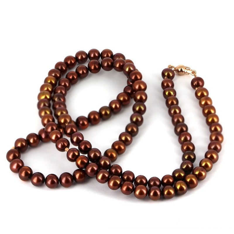 Schoko Süßwasserzuchtperlen Kette mit Kugeltonnenschloss aus Silber rotgoldplattiert in der Länge von 80 cm.