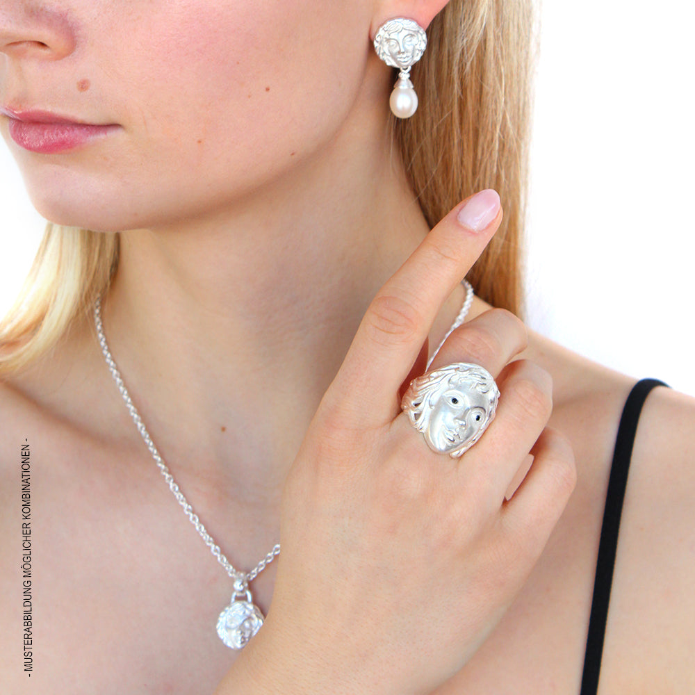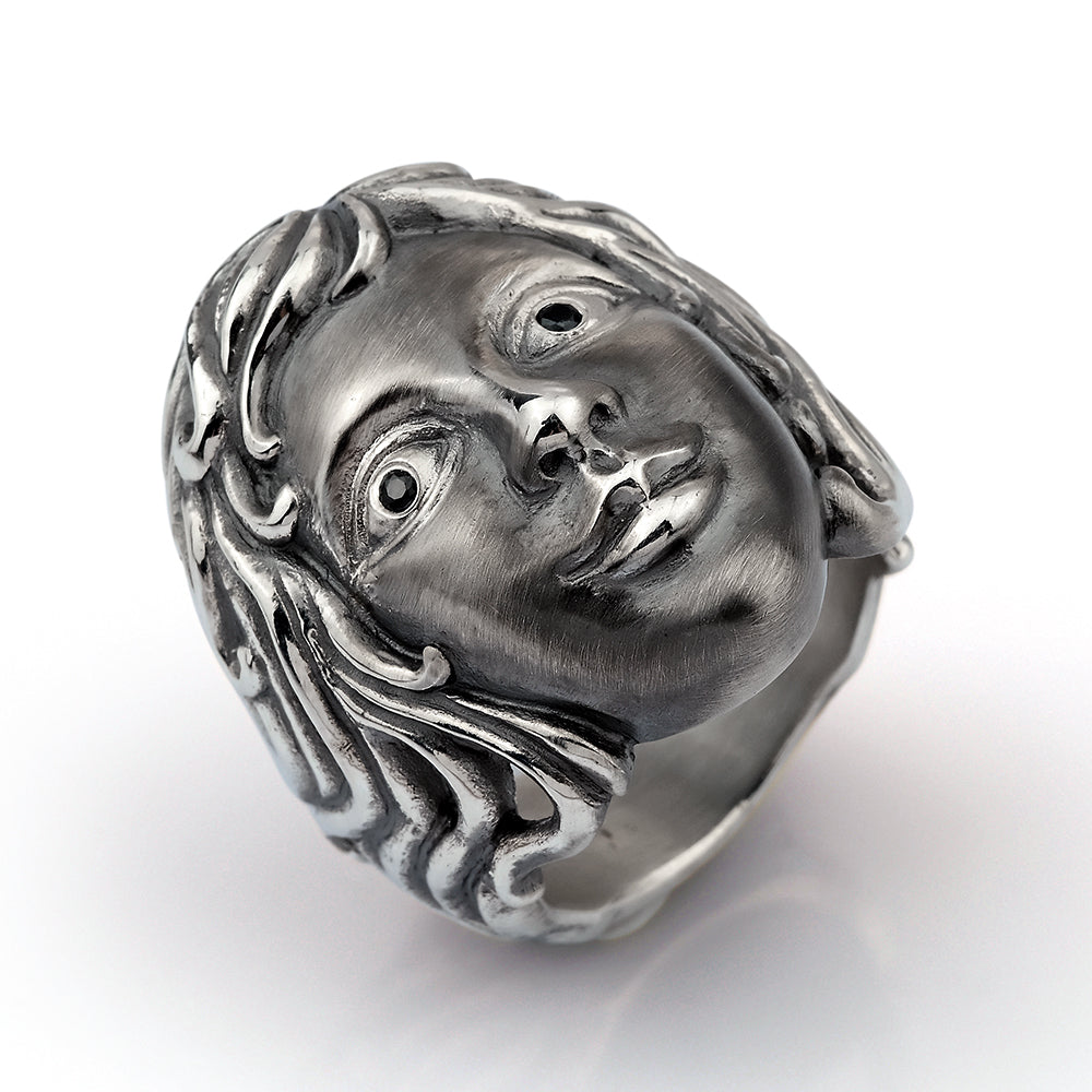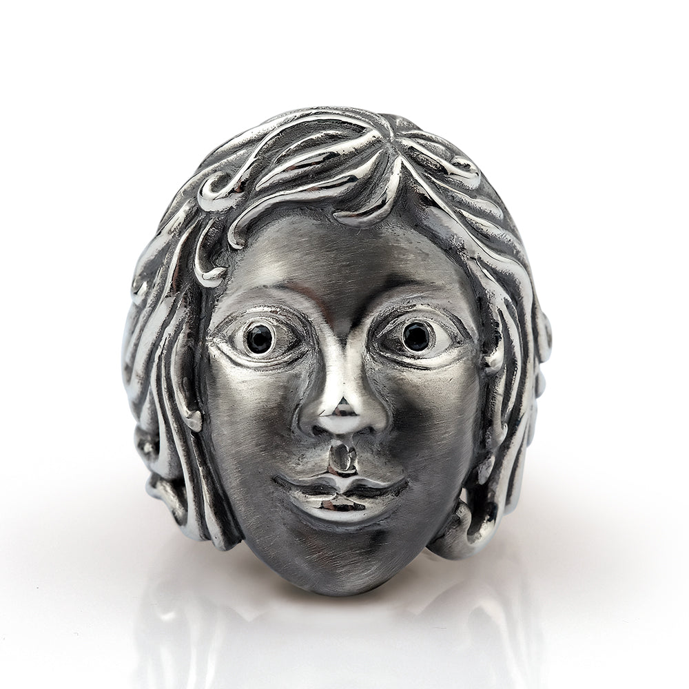 In den Augen strahlen funkelnd schwarze Spinelle. Der Legende nach verzaubert Aphrodite mit ihrer Schönheit und ihrem unwiderstehlichen Liebreiz alle, die ihr begegnen. Doch bei aller Sanftmut kann sie, wie alle Frauen, auch richtig wütend werden, wenn sie gereizt wird. Wir übernehmen keine Garantie, was passiert, wenn Frau diesen Schmuck trägt.... Ein traumhafter Schmuck für alle, die mächtige Ringe mit mystisch antiker Ausstrahlung lieben! Das Schmuckstück kommt frisch aus unserem Atelier, es könnte aber optisch auch aus einer antiken Sammlung stammen.