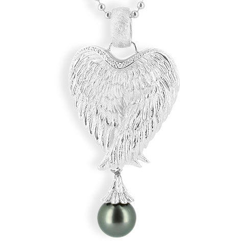 Angel by heart, großer Flügel Anhänger aus Silber mit Bergkristallpavée & beweglicher Tahitiperle (ca. 9 mm).