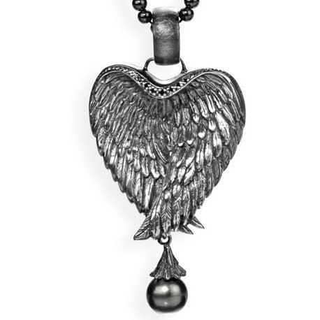 Angel by heart, großer Flügel Anhänger aus Silber im Vintagelook mit Bergkristallpavée & beweglicher Tahitiperle (ca. 9 mm).