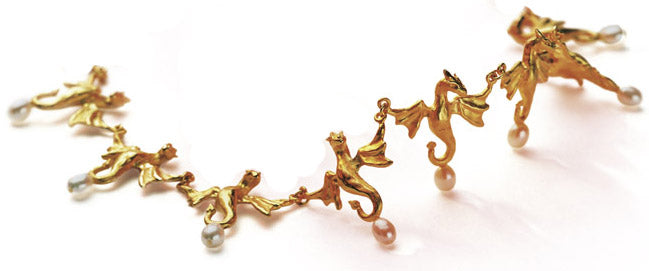 Dragonheart, Collier aus Silber goldplattiert mit Süßwasserperlen in der Länge von 45 cm.