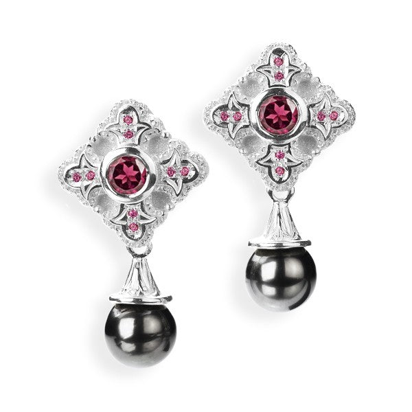 Faith Love & Charity, Kreuz Clipohrstecker aus Silber mit Rhodolithpavée und beweglichen Tahitiperlen (9 mm).