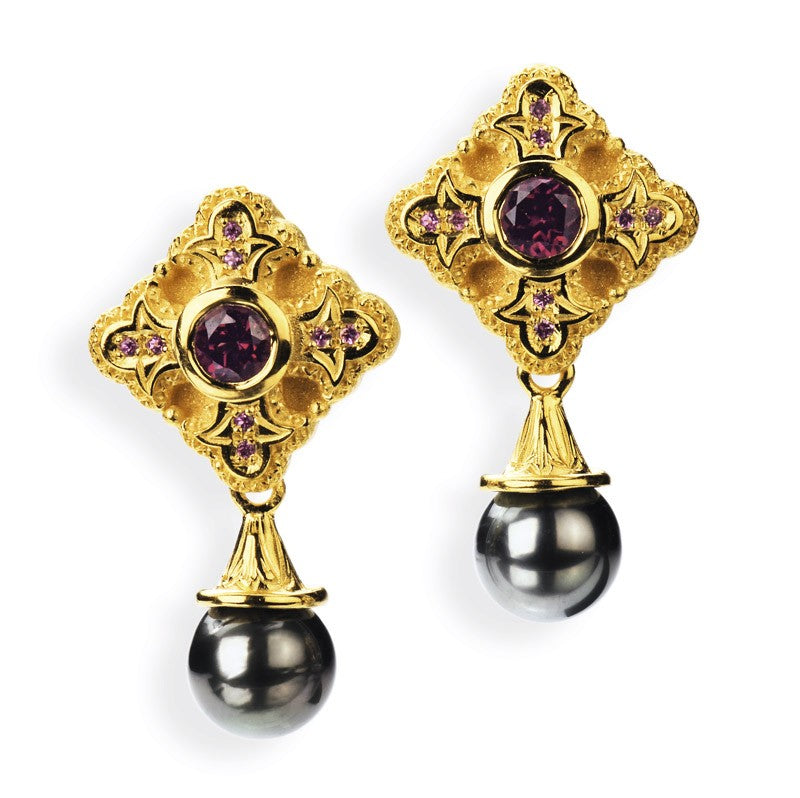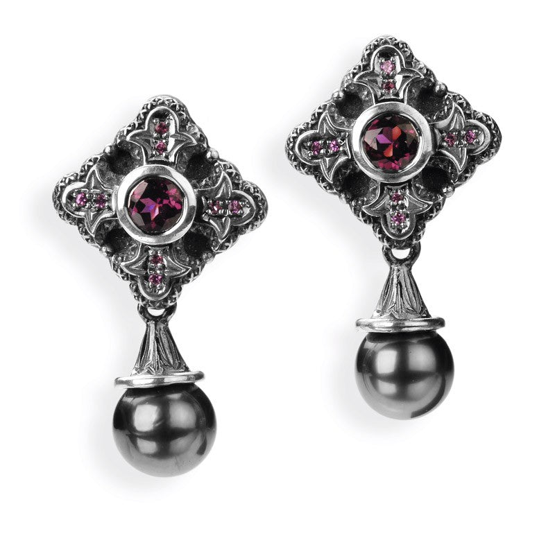 Faith Love & Charity, Kreuz Clipohrstecker aus Silber im Vintagelook mit Rhodolithpavée und beweglichen Tahitiperlen (9 mm).