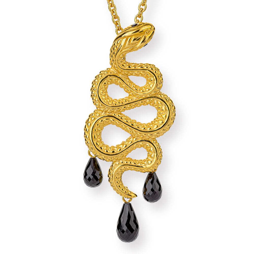 Serpente, großer Anhänger Schlange aus Silber goldplattiert mit Onyx und Onyxpampeln.