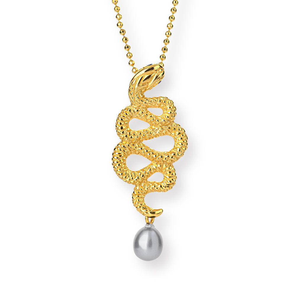 Serpente, kleiner Anhänger Schlange aus Silber goldplattiert mit Onyx und einer grauen Süßwasserperle.