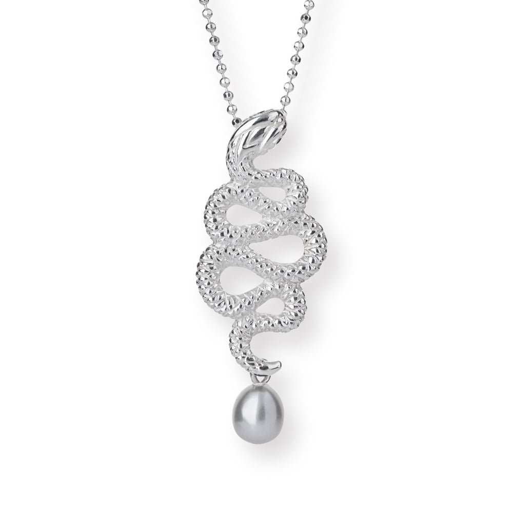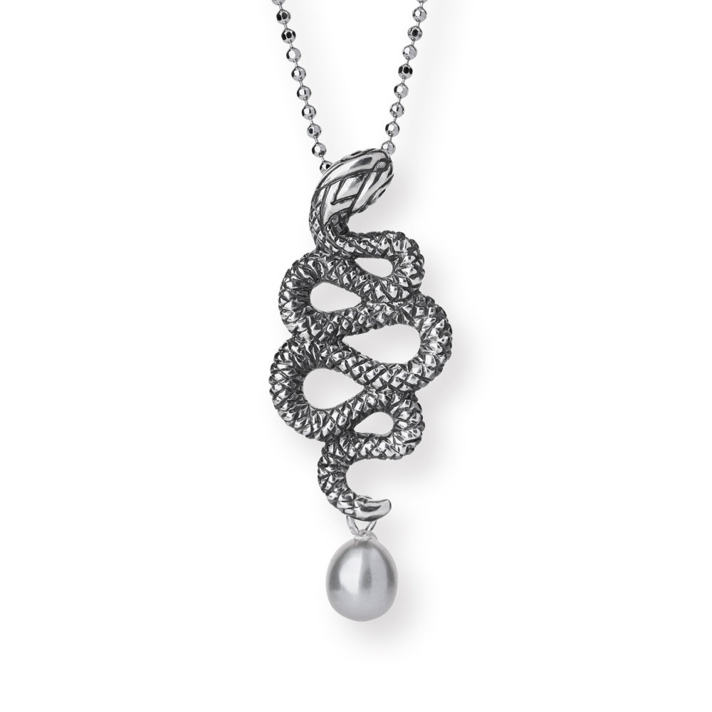 Serpente, kleiner Anhänger Schlange aus Silber mit Onyx und einer grauen Süßwasserperle.