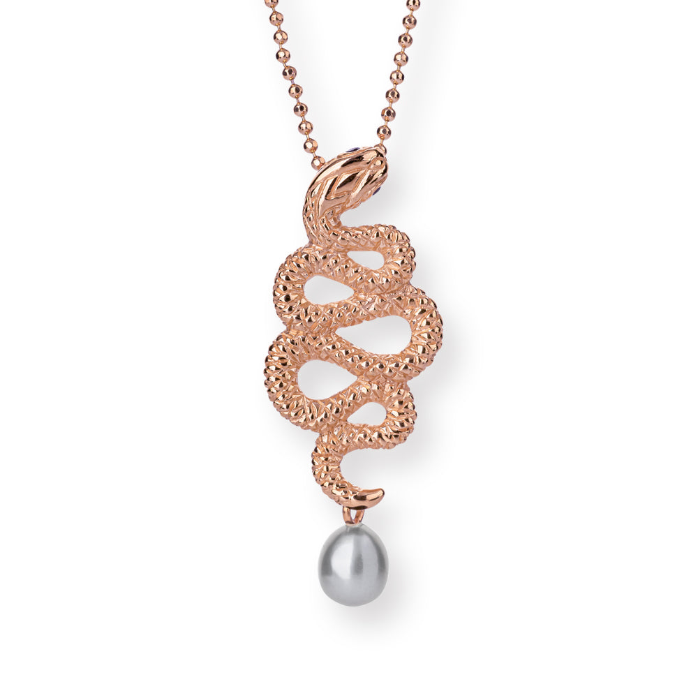 Serpente, kleiner Anhänger Schlange aus Silber rotgoldplattiert mit Onyx und einer grauen Süßwasserperle.
