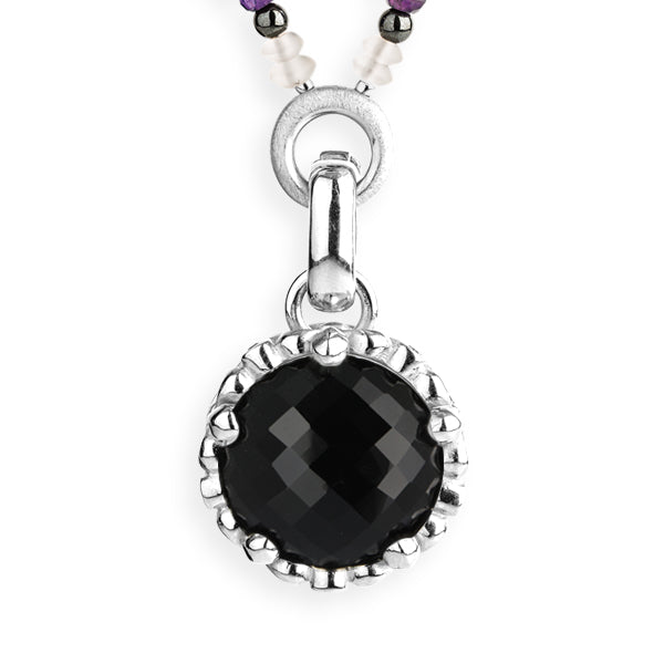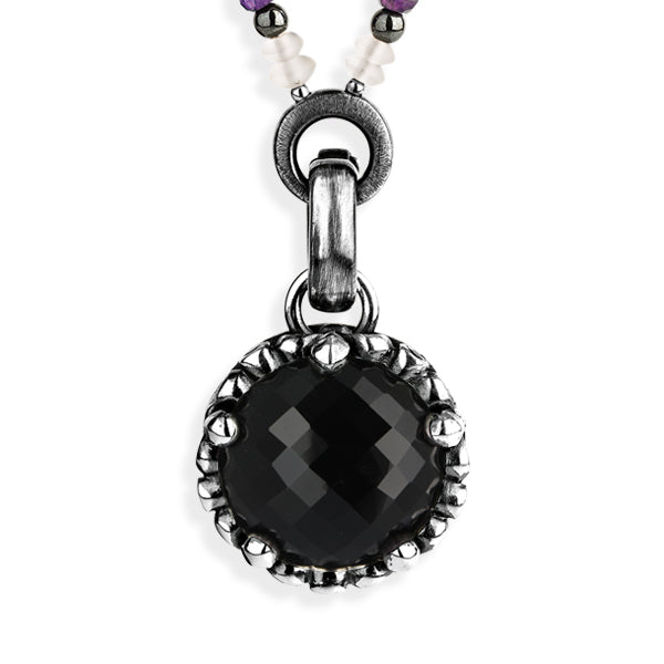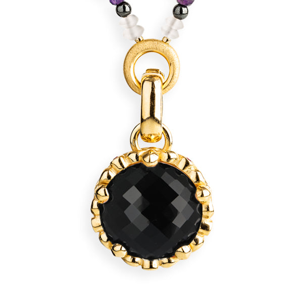 Der markante facettierte Onyx hat einen Durchmesser von 20 mm. Seitlich an der Krone sind 5 kleine facettierte Onyxsteinchen eingefasst. Ein toller Anhänger für Liebhaberinnen hochwertiger großer Edelsteine in außergewöhnlicher Verarbeitung!