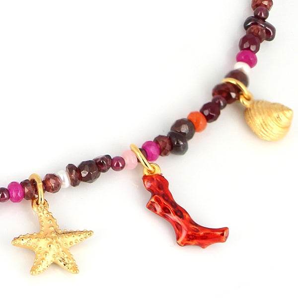 Neptuns Garden, 1-reihiges Collier aus rotem Perlmix mit 7 Muscheln und Tonnenschloss aus Silber goldplattiert. Die Länge des Colliers beträgt 45 cm.